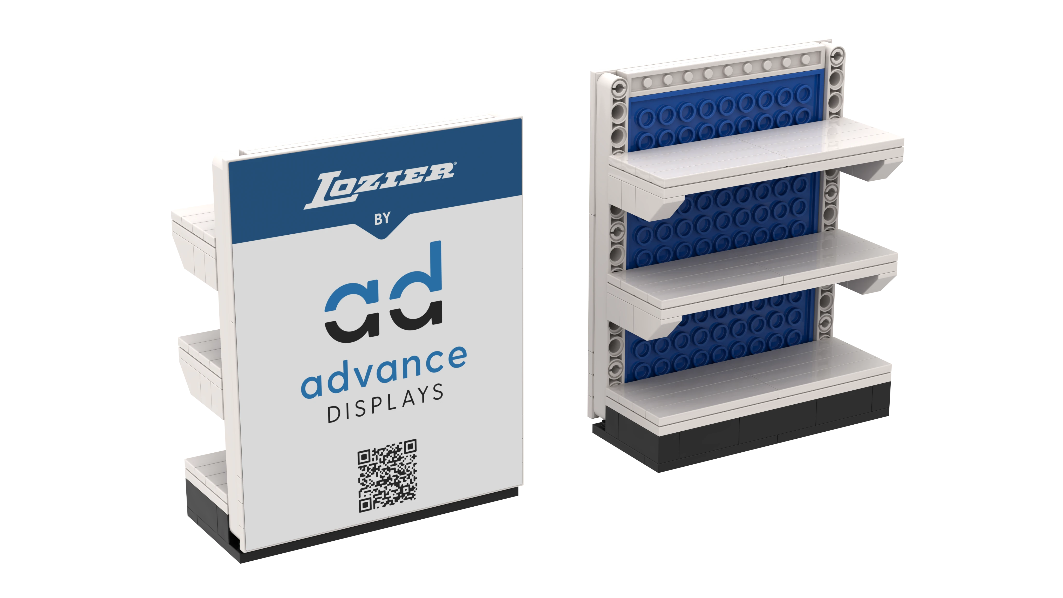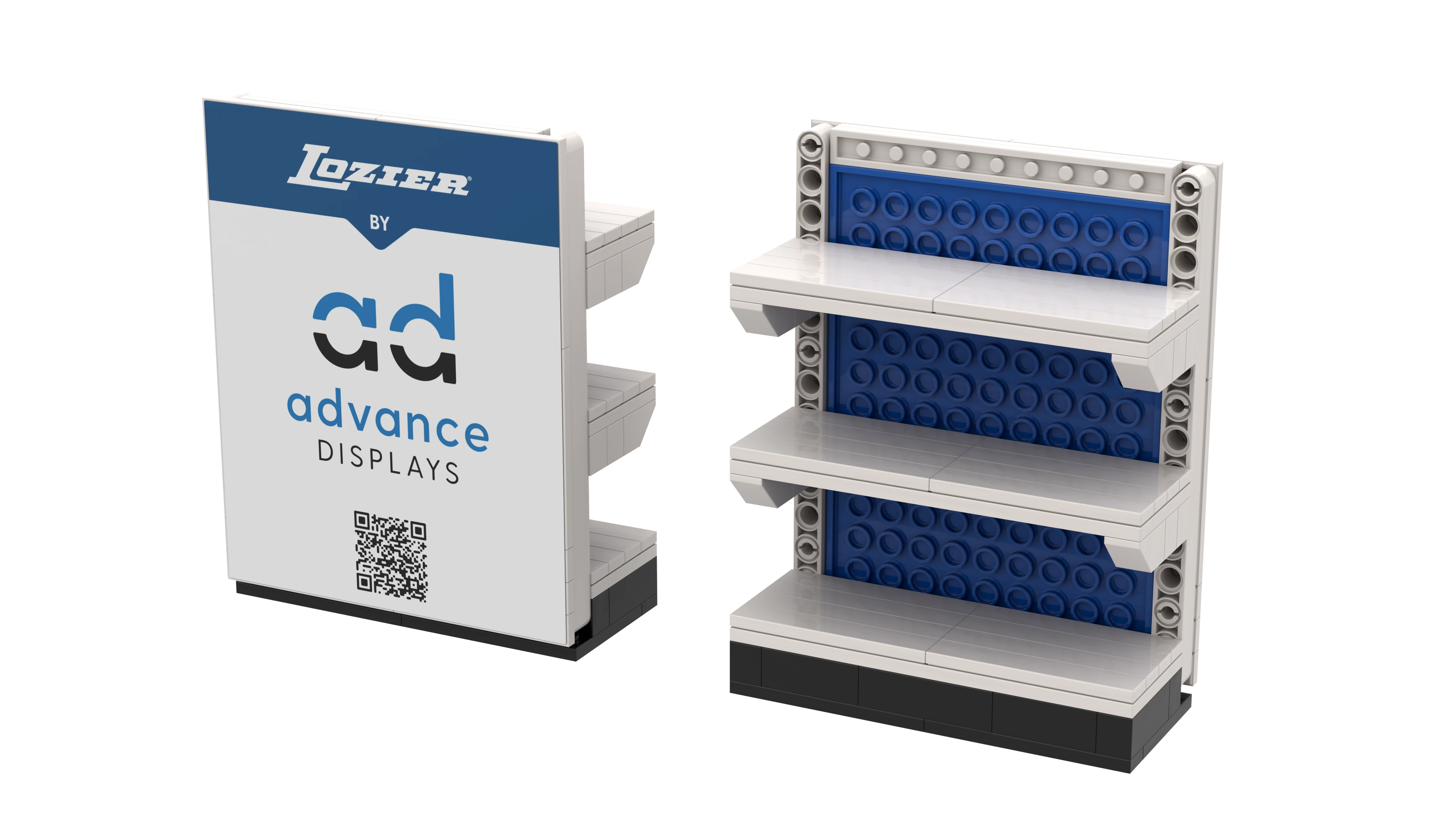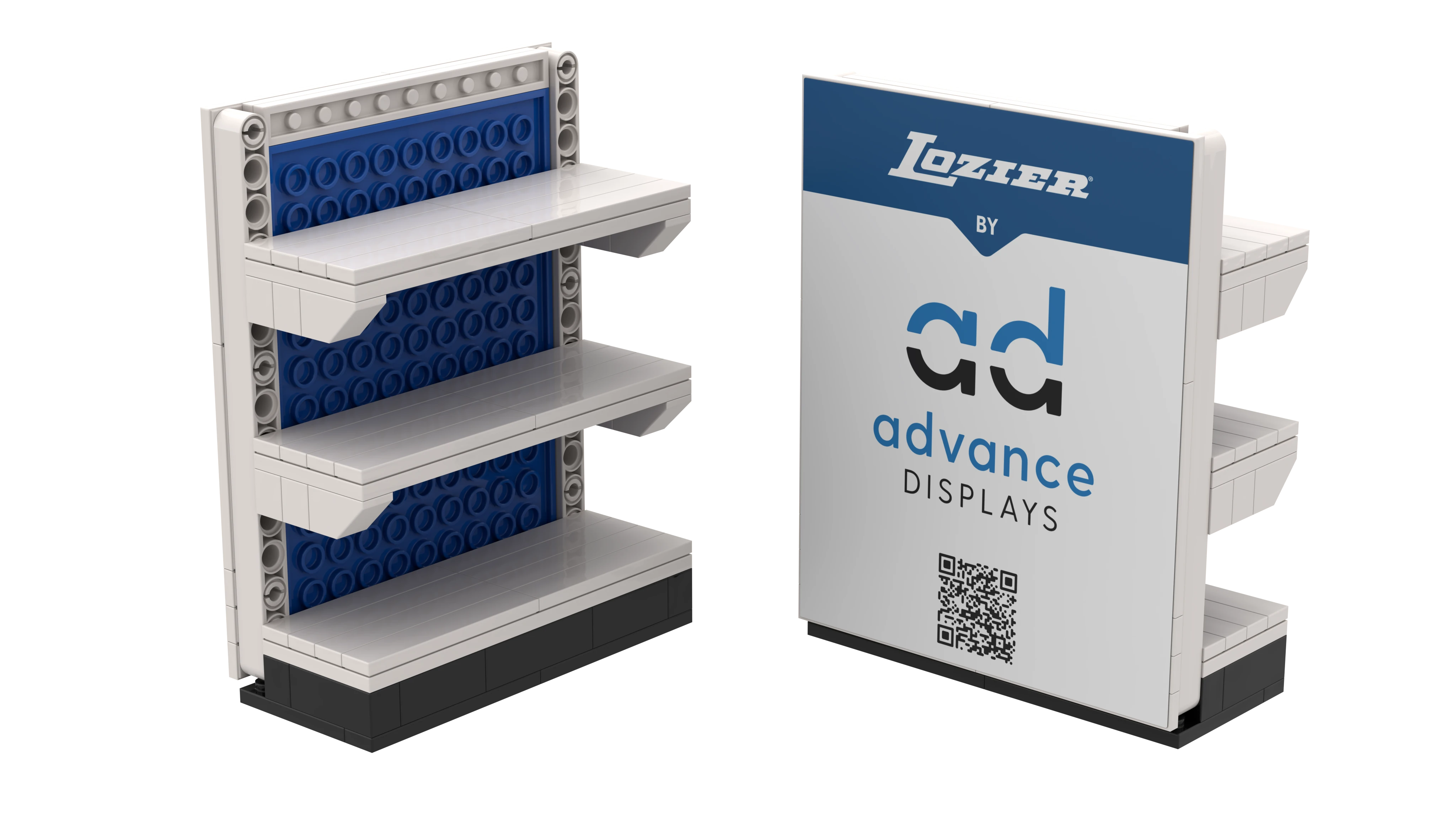 Advance Displays commissioned a custom Playwell Bricks design of Lozier’s bestselling gondola shelving. “They wanted a gondola system consisting of a single panel and two modular shelves,” explains Playwell Bricks designer José Bañuelos.