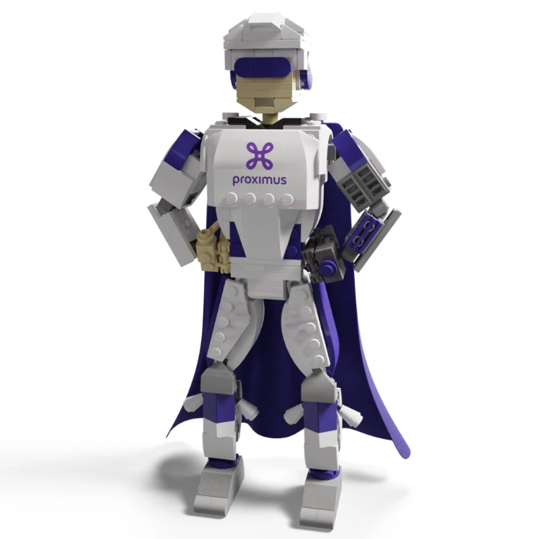 Proximus asked Playwell Bricks to design a "Proximus Business Partner" superhero with a costume displaying Proximus' brand colors.