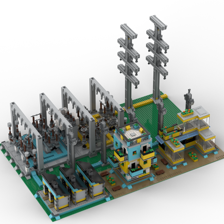 The final custom hydro station set had several sections: beginning with the hydro trucks and minifigs, the electrical poles, the substation itself, and three areas to represent the different areas that use electricity to function: industrial, commercial, and residential.