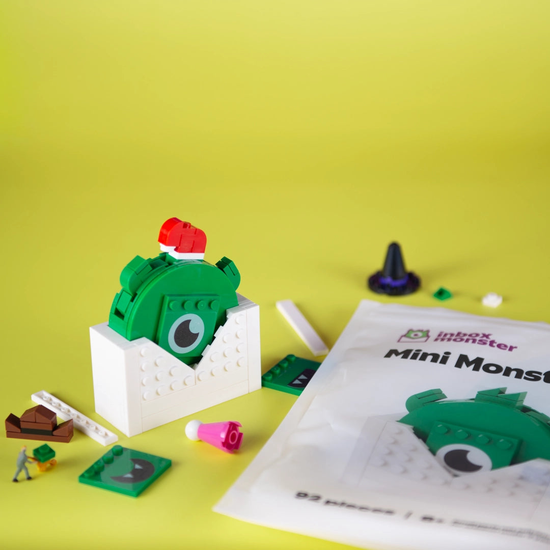 Playwell Bricks designer Pedro Lara got started on the design right away, mocking up a brick version of the monster with stickers to offer different facial expressions and accessories to wear on its head. After a little back-and-forth, Inbox Monster and Pedro worked out the best accessories, replacing one here, adjusting another there, before moving on to the next step.