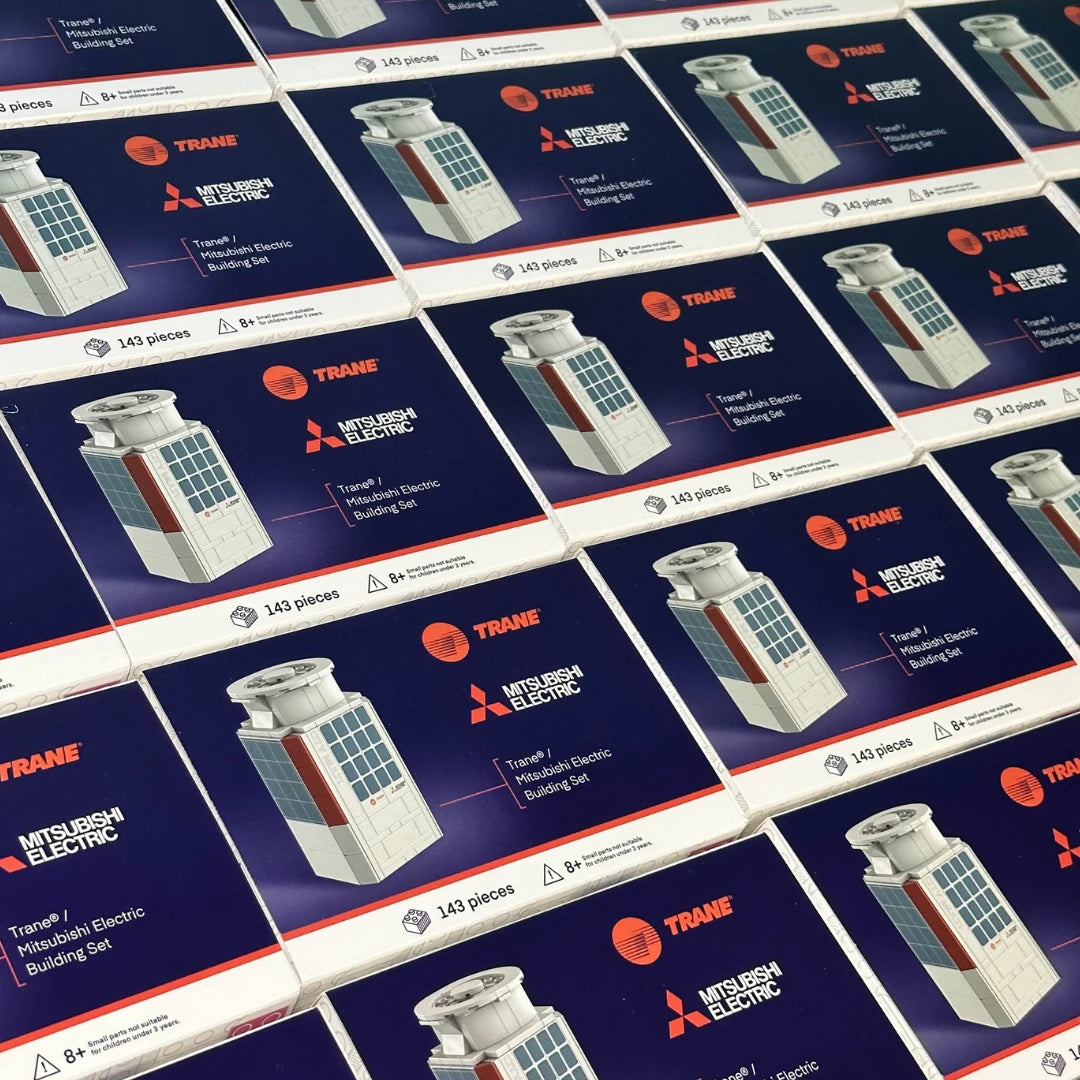 When Mitsubishi Electric came to Playwell Bricks, they wanted a custom Playwell Bricks of one of the HVAC units they created with Trane. These sets would serve as a promotional giveaway that both brands could celebrate.