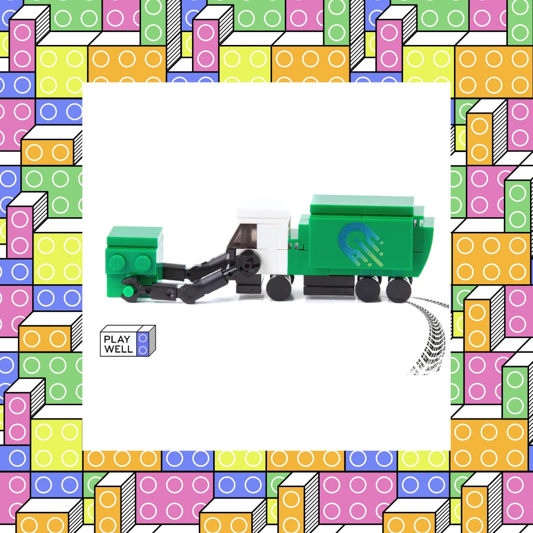 Playwell Bricks designed these gems for Orchestry, based on the theme of their software as a clean-up crew for their clients. “It’s a really small dump truck with dumpster arms to lift a bin and flip it up.”
