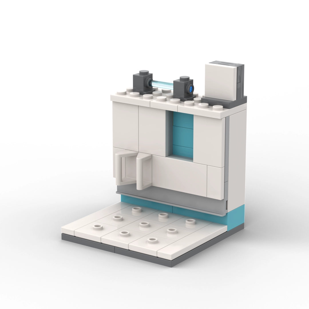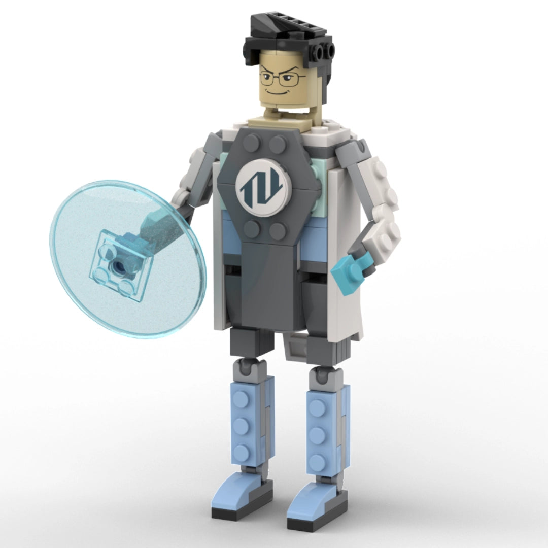 The final design of this powerful superhero was accomplished by Eric Dubois Yang, with face and the OPTOMAN chest logo decals handled by Kostik Poloskin. This brick OPTOMAN holds his trusty laser mirror for blasting virus cells, and he comes with a removable stand to represent his state-of-the-art laboratory.