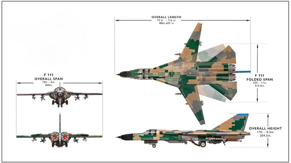 Building the custom set made with, in part, genuine LEGO® bricks F-111 Aardvark, was a great opportunity to immortalize all its pioneering avionics and technology, including the radar assembly beneath the fuselage for the F-111’s groundbreaking automated terrain-following radar.
