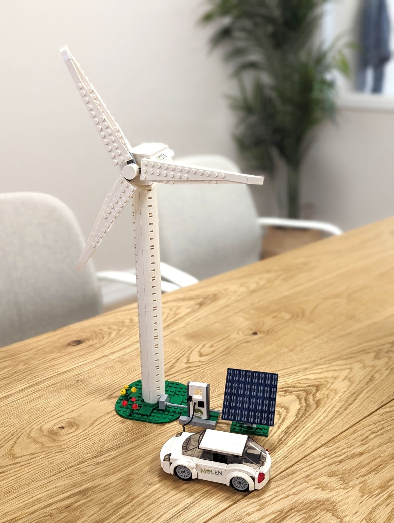 Impressed enough that they remembered him when they wanted a custom set to represent the work they do. Molen contacted Playwell Bricks and commissioned thirty custom Playwell sets of a wind turbine and a small solar array connected to a charging station and electric car.