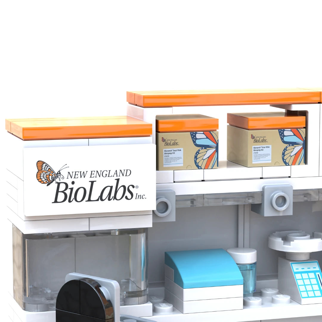 The life sciences company wanted a custom Playwell Bricks set of one of their very own biolabs to celebrate “50 years of passion for science.” In addition, they also wanted this lab to be stocked with New England Biolabs’ products and a custom minifig scientist in a lab coat.