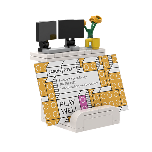 Elevate your workspace with our exclusive Business Card Holder – a blend of creativity and professionalism. Crafted from building. Imagine a computer desk adorned with dual computer screens made with genuine LEGO® bricks that display your message or logo through customizable decals, expressing your brand identity with flair.